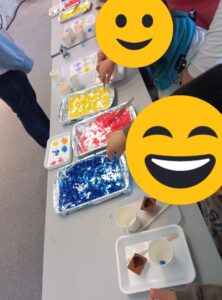 大阪市下水道科学館に行きました。下水道科学館でイベントに参加しました。うんち型の石鹸を「なにいろつくろうかな?」「ボクはブルー」「私はみどり」と自分の好きな色を選びます。