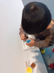 みどりの色は、黄色と青色を混ぜて作ります。ピンセットで挟んで…