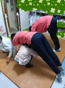 女の子チームはヨガ遊びに参加しました。骨盤歩き・V字バランスなどのポーズを呼吸法と一緒にしました。
