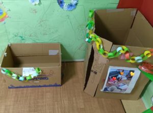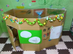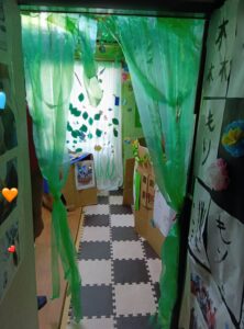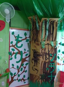 森に因んだお猿さんの絵やお家など様々な作品に「すごいねー!」というお声がたくさんありました。子どもたちも「これ僕、私が作ったよ!!」とお母さん、お父さんに満面の笑みで教えていました😉