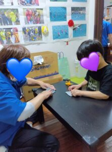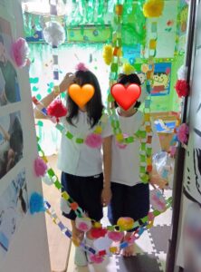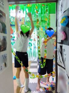 2025年 9/29(月)1日の様子 漢字や計算の宿題、書道「昼食」、「六日」支援員と一緒に頑張りました!! 折り紙の飾りで扉の前を封鎖。当たったらダメ🙅のレーザーを女の子2人で作りました。 「鶴」の折り方を丁寧に教えてくれました✨️