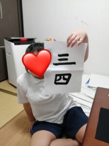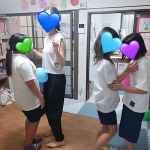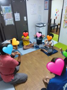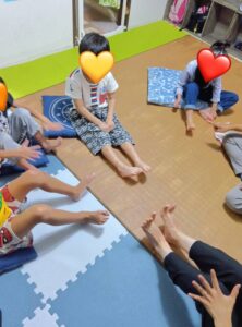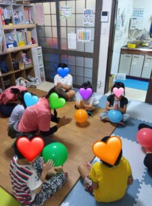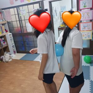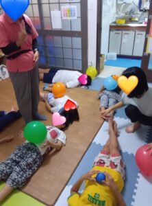 2025年 10/6(月) ヨガ教室!! ヨガの様子… 呼吸を整え、今日は風船を使ったヨガ!風船をお友達同士、お腹や背中で挟み、落とさずに歩けるか!?など、様々なことをしました。また、風船を膨らませるコツも学びました! 書道の様子……