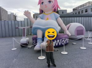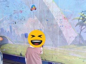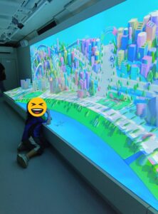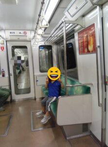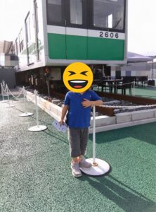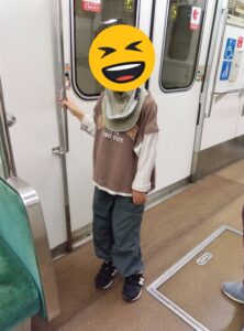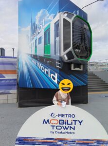 2025年10月18日(土曜日) モビリティタウンへ行こう! モビリティタウンへ行くのを楽しみにして、電車に乗っていました。 「しっかり手すりをつかまえてるよ」 雨がポツポツ降ったり暑くなったりする天気でしたが、気にせず元気いっぱいに未来の乗り物や大阪の街を見学しました。