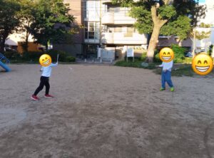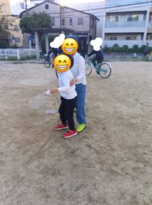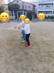 お兄ちゃんが小さい子にバドミントンを教えている姿が微笑ましいですね