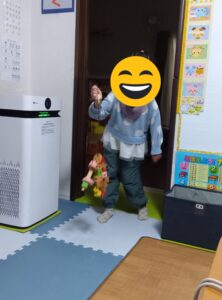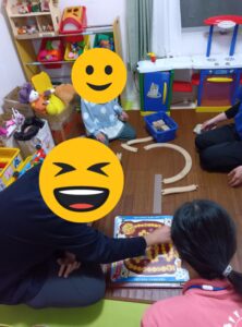 左手でひも通しを持ち右手で穴のあいた積み木を通しました。「みて〜みて〜」と笑顔いっぱいです。