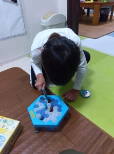 ペンギンの氷崩し、ペンギン🐧を落とさない様に優しく工夫しながら氷をたたいてまーす。