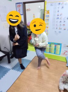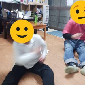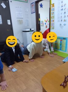 今日も男の子チームと女の子チームに別れてヨガ遊びに参加しました。あぐらを組んで呼吸法からはじめます。