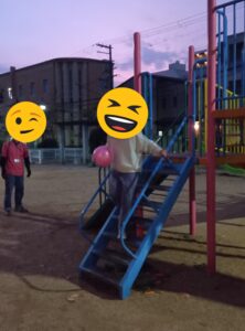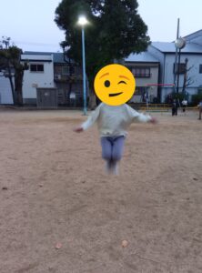 ヨガ遊びが終わって「公園に行きたい!」との事で、近くの公園に行きました。「縄跳びで二重跳びするから見て」