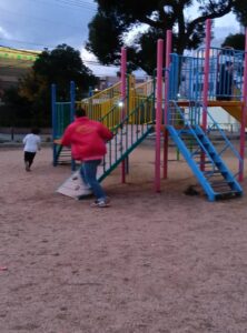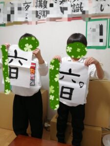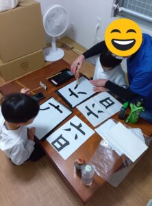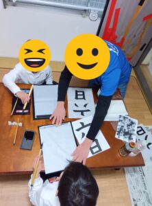 2025/12/15(月)習字教室&好きな遊び 教室は習字教室です。子ども達は習字の先生のお手本をしっかりと見て集中して書きました。 「僕達上手に書けてるよ!」 おやつを食べた後は公園に行きました。ブランコや鬼ごっこをしました。