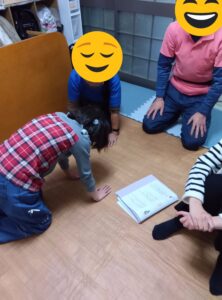今日は、ヨガ遊びです。冷えた身体をゆーらゆーら準備体操でヨガの呼吸法、吸って吐いて吸って吐いて、身体はポカポカです。