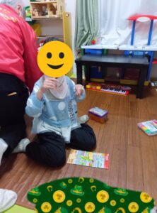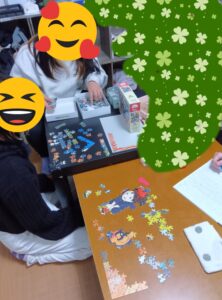 「ピース🧩がたくさんあるからムズいわ〜」と言って支援員と楽しくピースをはめていきます。〇〇ちゃんは、「私も負けないぞ〜」とシールをはりあわせていました。