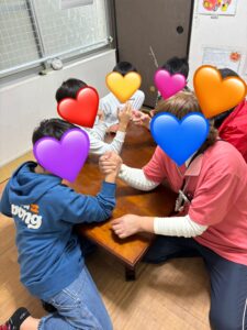 今日は積み木パズルやスマートボール、腕相撲、工作…と子どもたちそれぞれの【強み】を発揮してくれました!!