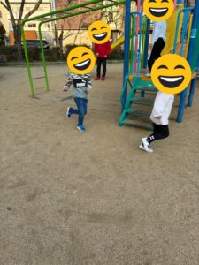 青空ヨガに誘いましたが、鬼ごっこをやりたがり、楽しんでいました。