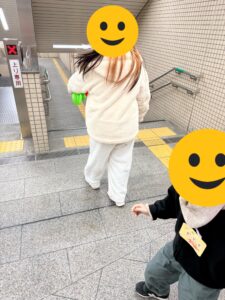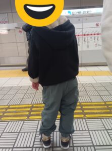 帰り時に黄色い線を踏んだら「オウト!」と言い、モノ避けゲームで盲人用の線を意識させる。