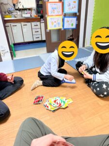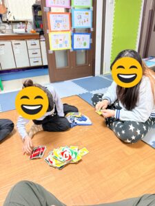 ウノで〇〇ちゃんは小さい友達にお姉ちゃんのように優しく遊びに誘導しました。