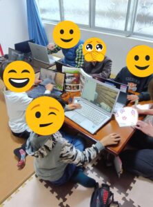 利用者さん、みんなが楽しみにしているプログラミング教室。講師の先生が持って来てもらったマイクラの本を見ながら協力して建物を作っています。