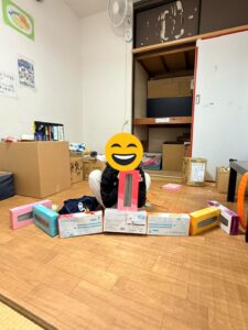 〇〇君はティッシュ箱を紙バネで繋げて操り人形を作成しました。