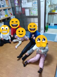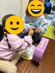 途中から雨が降ってきたのでお部屋で過ごすことになりました。キキ・ララのおもちゃで、高学年の〇〇ちゃんが幼稚部の〇〇ちゃんと優しく遊んでくれました。