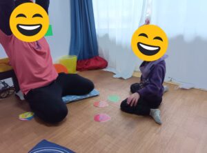 色を紹介しました。床に色紙を広げ、先生が言った色と同じ色紙にタッチする活動を行いました。