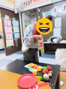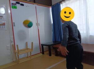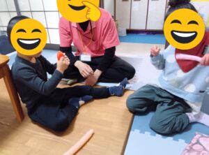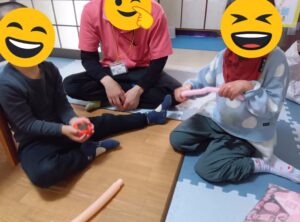 柔らかいボールをクネクネ、蛇腹の筒を少しずつ伸ばしてまーす。