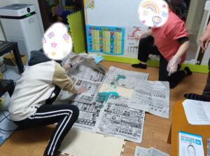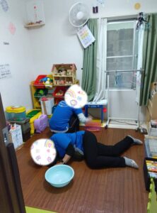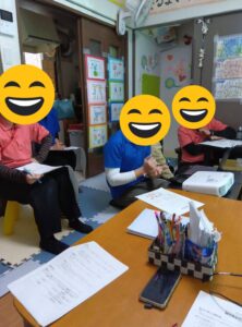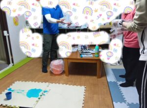 今日は嘔吐物処理方法の研修行いました。研修後、実践訓練を行いました。