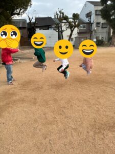 ヨガ遊びが終わって公園へ行き、低学年のお友だちと大縄跳びをしました。