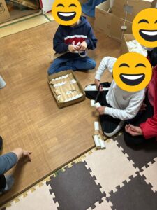 〇〇くんは小さな木箱を積み重ねて、お城や塔を作ろうとしていました。