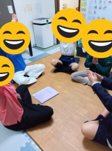 高学年の〇〇ちゃんと〇〇ちゃんは、ヨガ遊びに参加です。あぐら座で挨拶をして 呼吸法、骨盤歩き、木のポーズ、支援員さんと一緒に行いました。