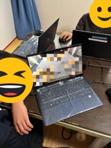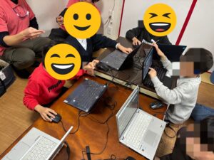 外遊びで満足したら次はプログラミング教室みんなで連携しながら楽しんでいます。